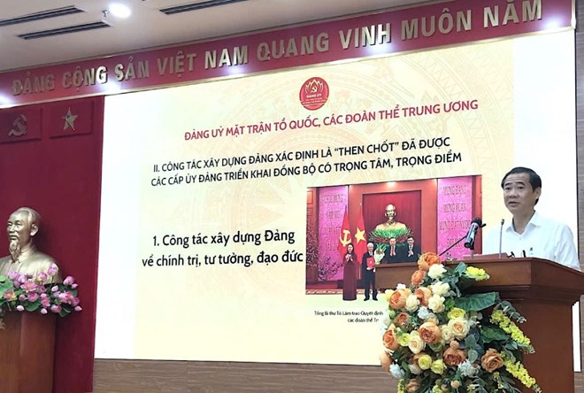 Ảnh: Đồng chí Nguyễn Thái Học - Phó Bí thư Đảng ủy Mặt trận Tổ quốc, các đoàn thể Trung ương truyền đạt chuyên đề tại hội nghị.