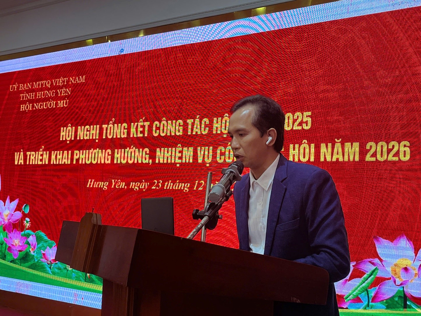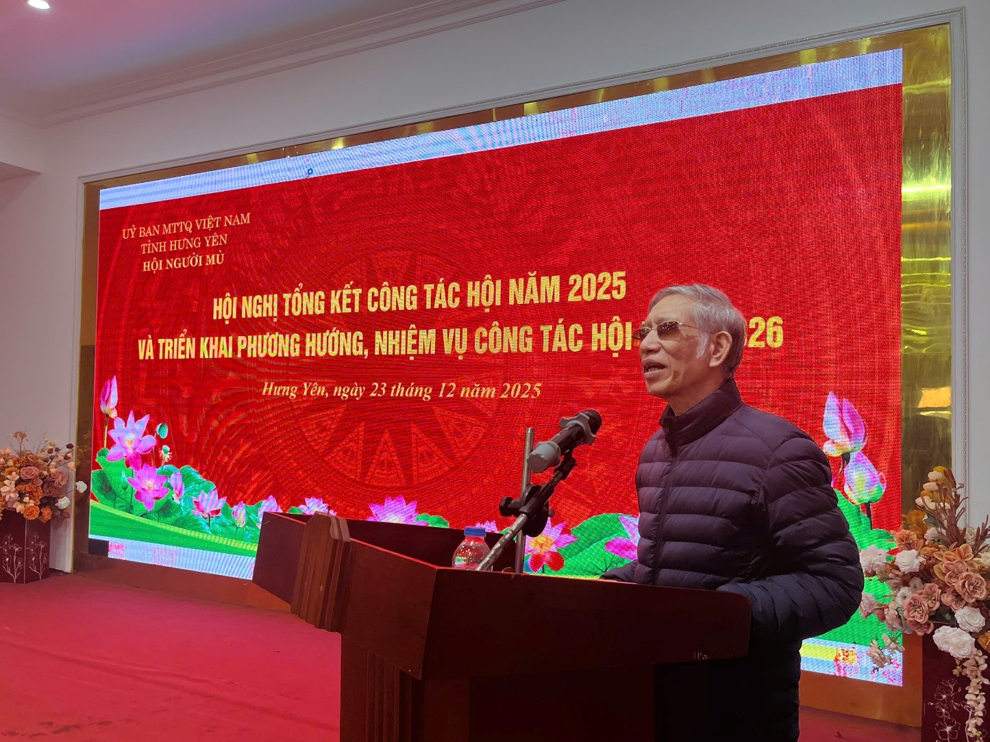 Phát biểu chỉ đạo hội nghị, đồng chí Phạm Viết Thu – Chủ tịch Hội Người mù Việt Nam ghi nhận và biểu dương những nỗ lực, cố gắng của Tỉnh hội Hưng Yên trong năm 2025. Đồng chí nhấn mạnh: “Hội Người mù tỉnh Hưng Yên cần tiếp tục củng cố tổ chức Hội vững mạnh, đổi mới phương thức hoạt động, chú trọng đào tạo nghề, tạo việc làm bền vững cho hội viên, phát huy tinh thần đoàn kết, tự lực, tự cường, góp phần giúp người mù ổn định cuộc sống và hòa nhập cộng đồng.”