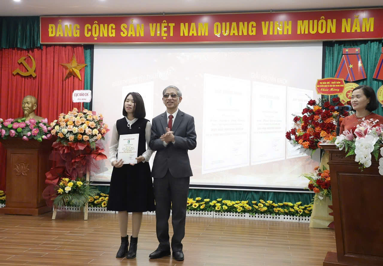 Ảnh: Tiến sĩ, Nhà báo Đồng Mạnh Hùng trao giải Ba cho hai thí sinh có mặt tại điểm cầu chính.